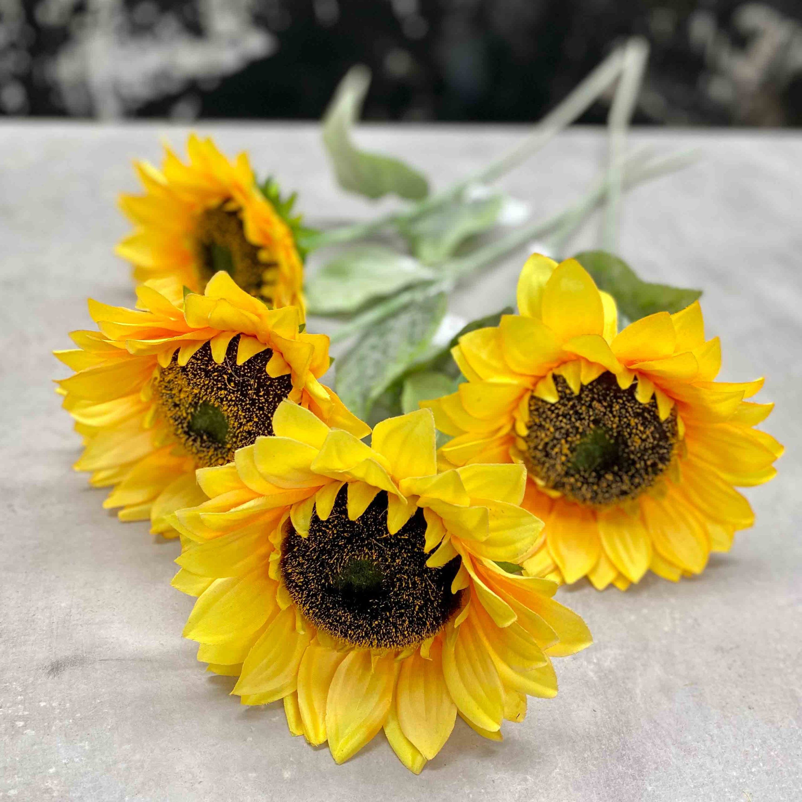 Élethű selyem szirmú napraforgónk tapintásra is megegyezik a valódival. Szár része és levelei bársonnyal vannak borítva. Fejének méreteit tekintve a 17 cm átmérőjével is a valódi társának képét tükrözi. Szár hossza 64 cm.