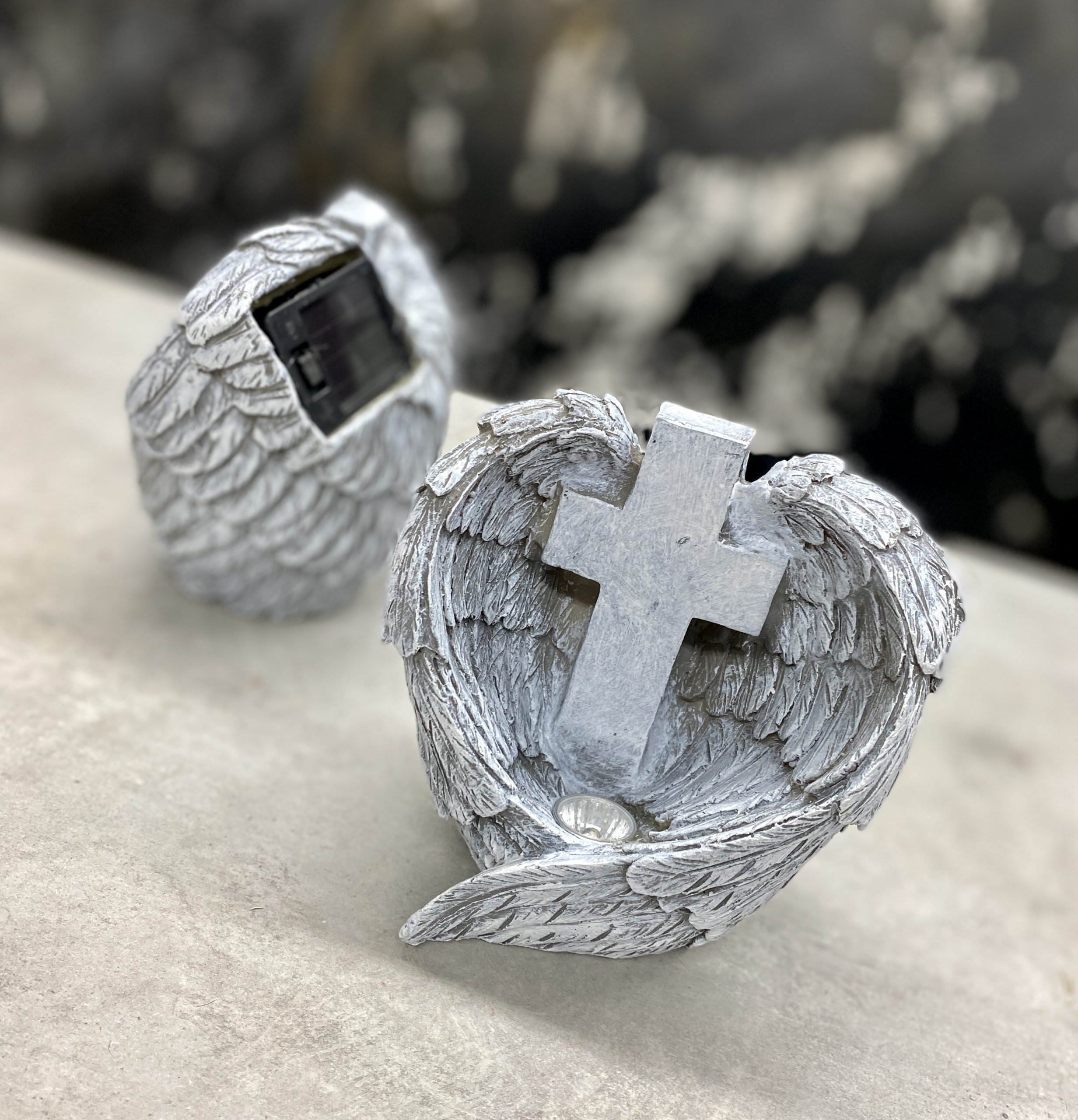 Kő hatású műanyagból készült angyalszárny formájú sírdísz. A szárny egy Nyugodj békében feliratú keresztet vesz körbe, amely alatt egy kis lámpa található. A lámpa napenergiával működik. (nappal töltődik, este világít). Nehéz anyagú, ez által masszívan megáll a talpán.