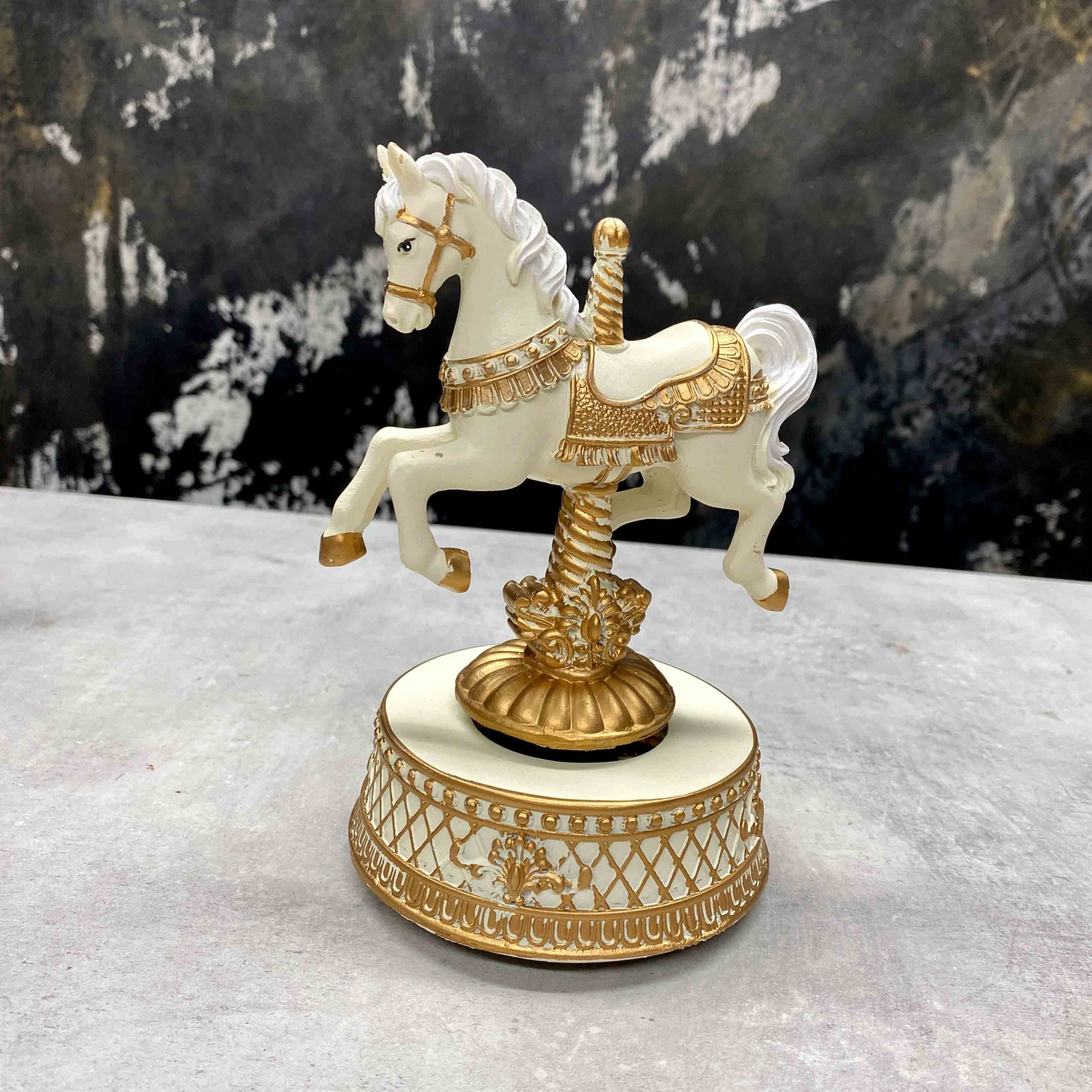 18 cm magas, felhúzható, zenélő hintalovas körhintánk kerámia anyagból készült. Talapzata 11 cm széles. Aprólékos kidolgozású, bronz domborfetéssel.